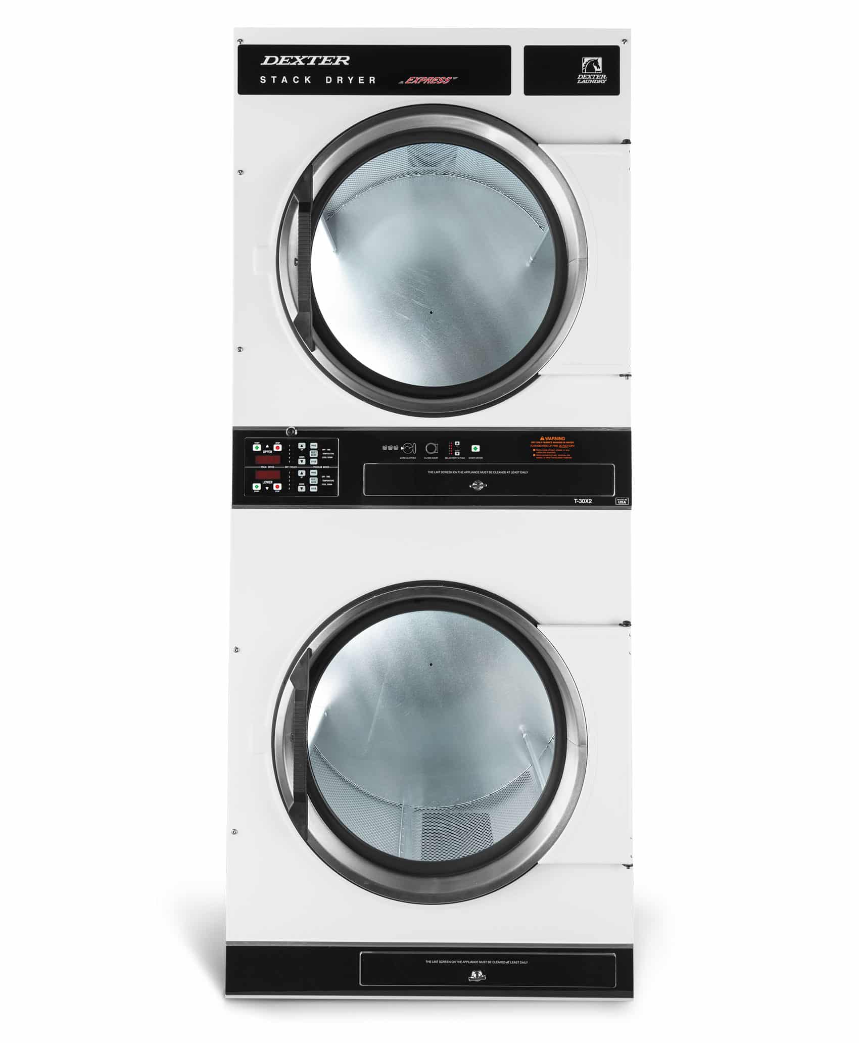 Dexter T-30×2 30lb On-Premise Stack Dryers, Total 60lb Capacity, 6 Program Microprocessor, Black Graphics, Natural Gas, White Panel, Stainless Steel Door, 90,000 BTU, 600 CFM, Air Recirculation, Fully Perforated Galvanized Cylinders, Heavy Duty Welded Frame, Single Gas and Electrical Connections, Extra Large Replaceable Lint Screens, Single 8” Exhaust Duct, 120, 208/240/60/1