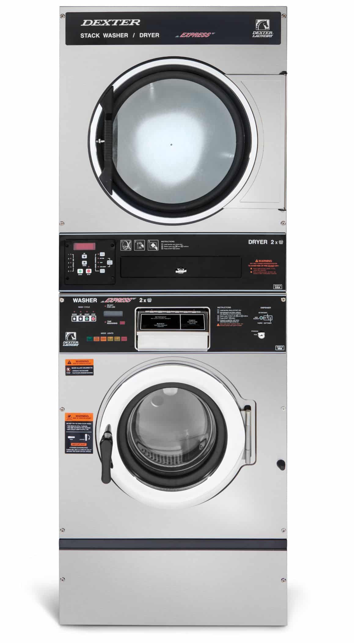 Dexter T-350 SWD 20lb Capacity 6-Cycle On-Premise Stack Express Washer/Natural Gas Dryer, Microprocessor, Black Graphics, 200 G-force Extract, 6 Preset Cycles, Stainless Steel Front Panel, Chrome Door, Variable Speed Drive, Emergency Stop Button, 304 Stainless Steel Cylinder, (Dryer) 56,000 BTU, 370 CFM, Air Recirculation, Fully Perforated Galvanized Cylinder, Single Gas and Electrical Connections, 6” Exhaust Duct, Washer: 208-240/60/1 or 3; Dryer: 120, 208-240/60/1