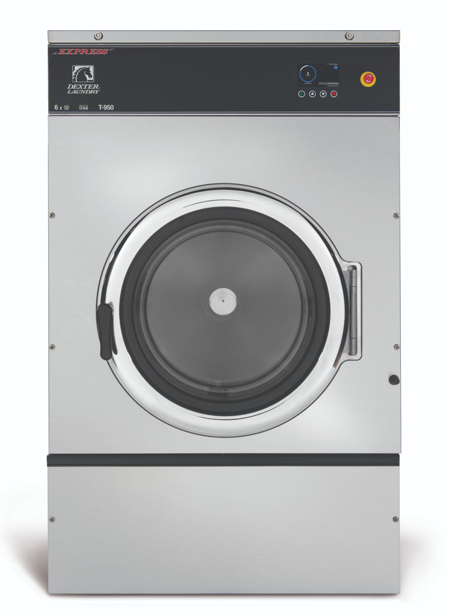 Dexter T-950 60lb Capacity O-Series On-Premise Express Washer, Total Control LCD Display and O-Series Controls, Black Graphics, 9.0 cu. ft., 200 G-force Extract, Pressure Sensor, Variable Speed Drive, 100 Fully Customizable Cycles, Management Tools, Programmable Chemical Injection System, 304 Stainless Steel Cylinder, Outer Tub, Top, Front and Side Panels, Heavy Duty Bearing and Seals, 208-240/60/1 or 3